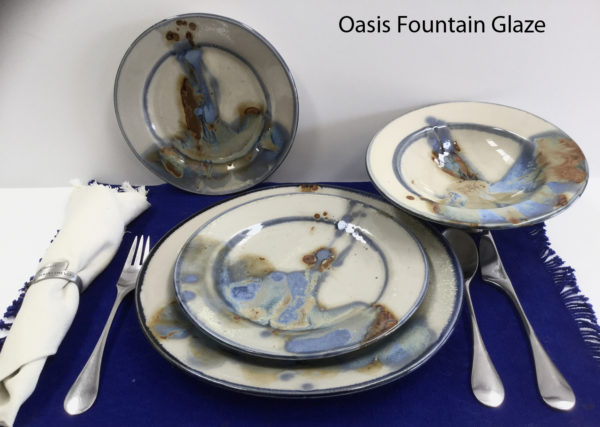 The place setting is comprised of a dinner plate, salad plate, rimmed soup bowl and dessert plate. Each piece is hand made and glazed so there will be some variation in color. These pieces are fired to 2400* and can be used in the dishwasher and microwave. The dinner plate is 11.5″ in Dia. The salad plate is 9″ in dia. The cereal / soup bowl is 8.5″ in dia. and the dessert plate is 8″ in dia.